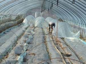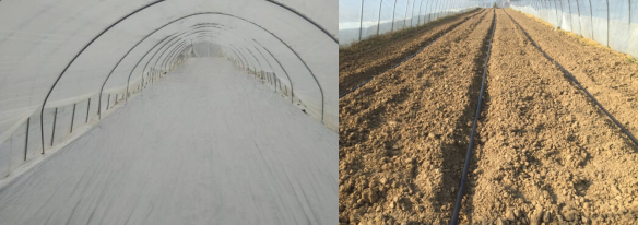 整地:选用连续三年以上没有种植过瓜类的土地,施足底肥,底肥以腐熟的农家肥为主,配合使用氮磷钾17:17:17的复合肥20-30kg/亩,深耕20cm后起垄,起垄。垄面宽150cm,沟宽50cm米,垄高15-20cm。地势较高的大棚可不起垄,将土地深翻后,在棚内开沟直接定植,以6米棚为例,离棚边1米处各开沟1条,棚中间开沟一条,沟内铺设滴灌带。整个大棚用黑地膜全部覆盖,整地在甜瓜育苗之前完成,地膜覆盖完成后,将大棚紧闭,给土地升温。