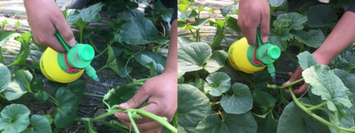 坐果留瓜:采用氯吡脲喷瓜,稀释按照0.1%的氯吡脲10ml兑水1kg,现用现配,小喷壶喷瓜,选择当天要开放或当天开放的雌花,在瓜的正面喷一次,反面喷一次,不要重复,不要只喷一面,否则容易出现畸形瓜。在瓜后留两片叶子摘心。