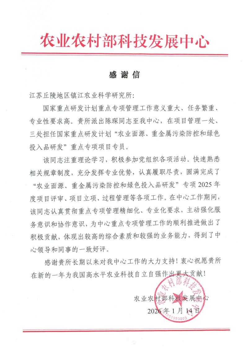 农业农村部科技发展中心向我院发来感谢信